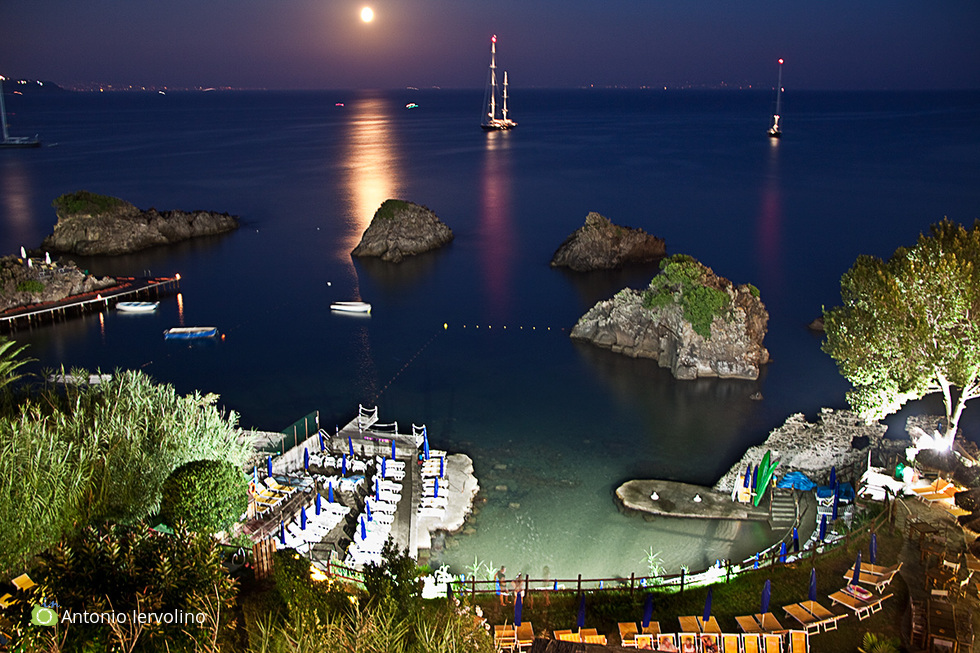 Serata estiva, la tranquillità della baia di Cartaromana al sorgere della luna. Il Gardenia mare illuminato e i famosi scogli di Sant'Anna.